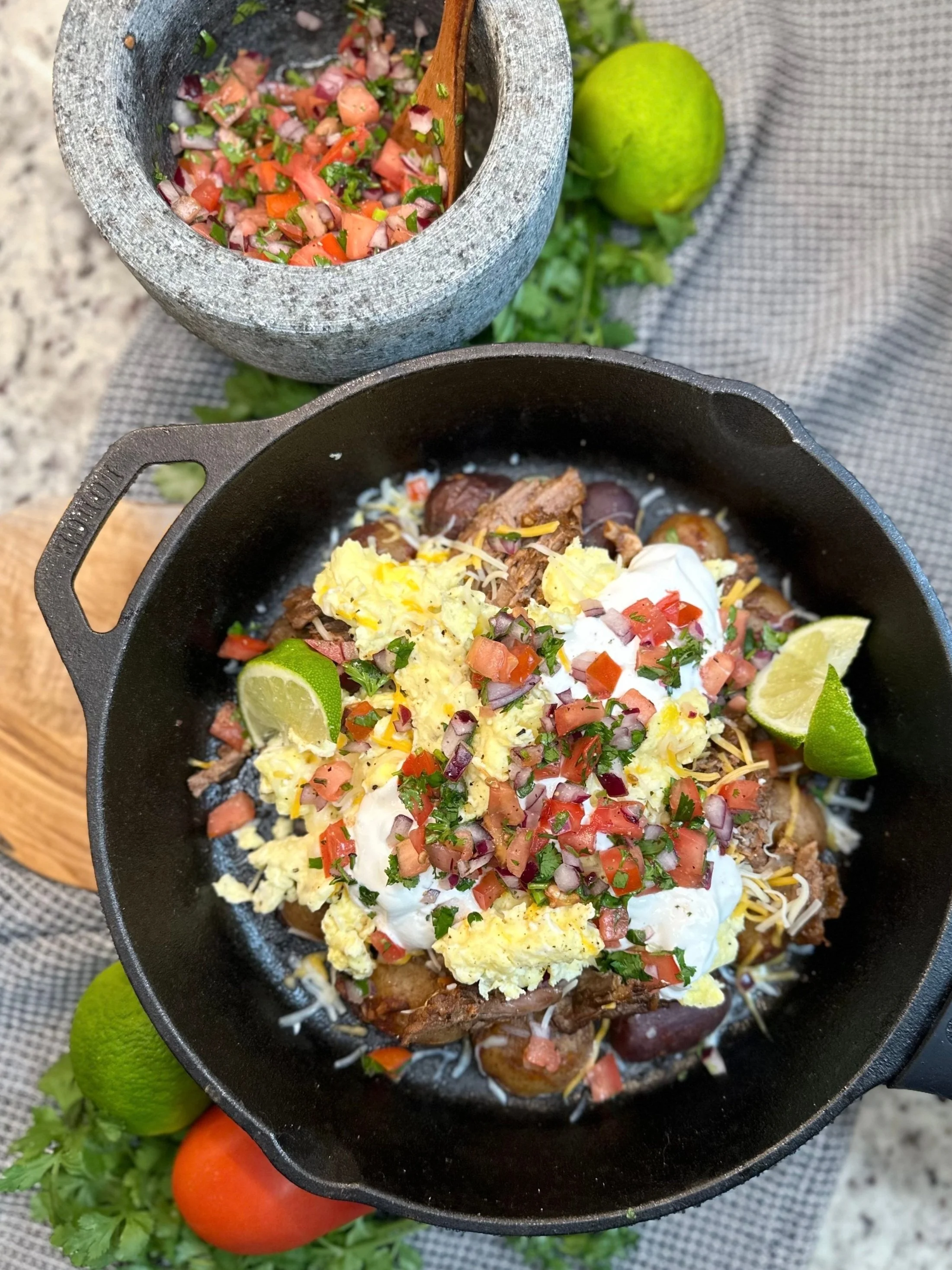 5) Once the potatoes are crispy and pot roast is warmed through, assemble your skillet. Add your cooked eggs, cheese, sour cream, pico, and some fresh sliced avocado. Squirt with some lime juice, and season with fresh cracked pepper. Serve immediately and enjoy!