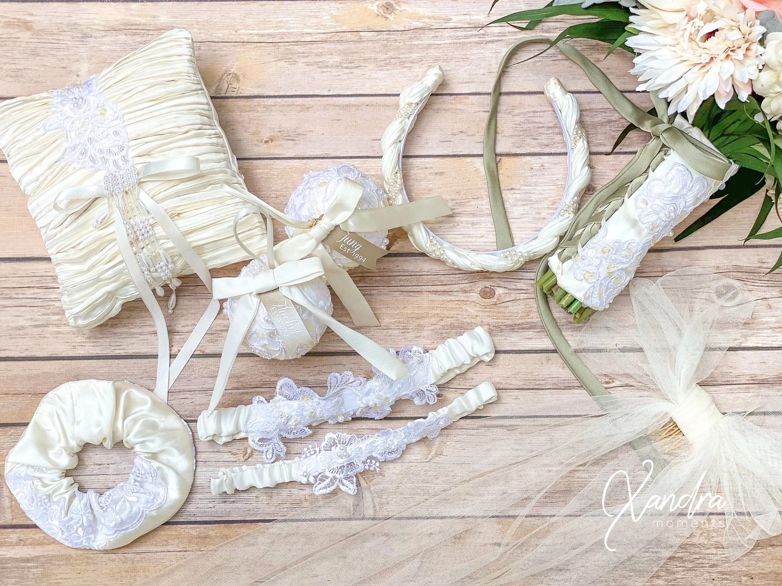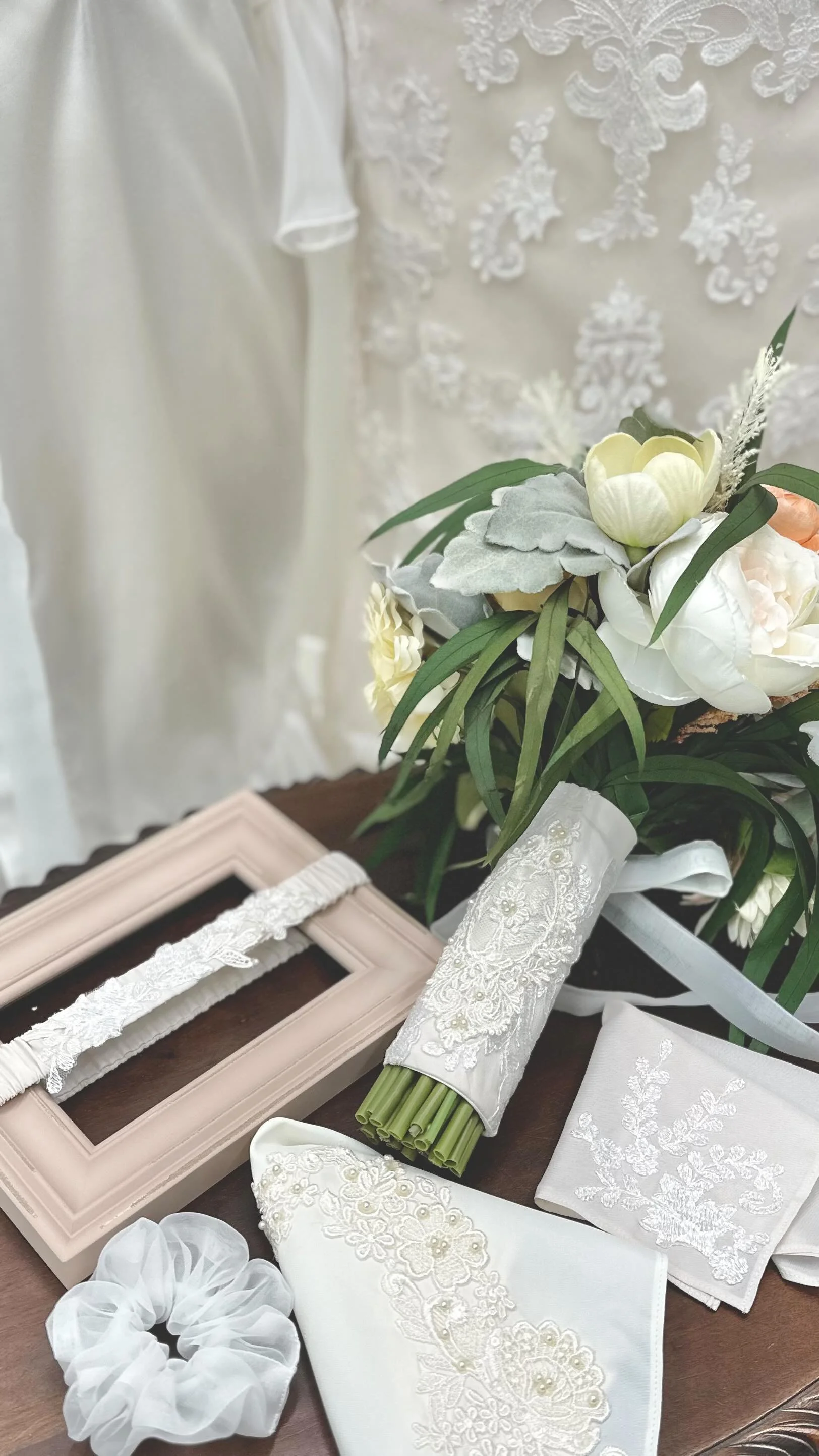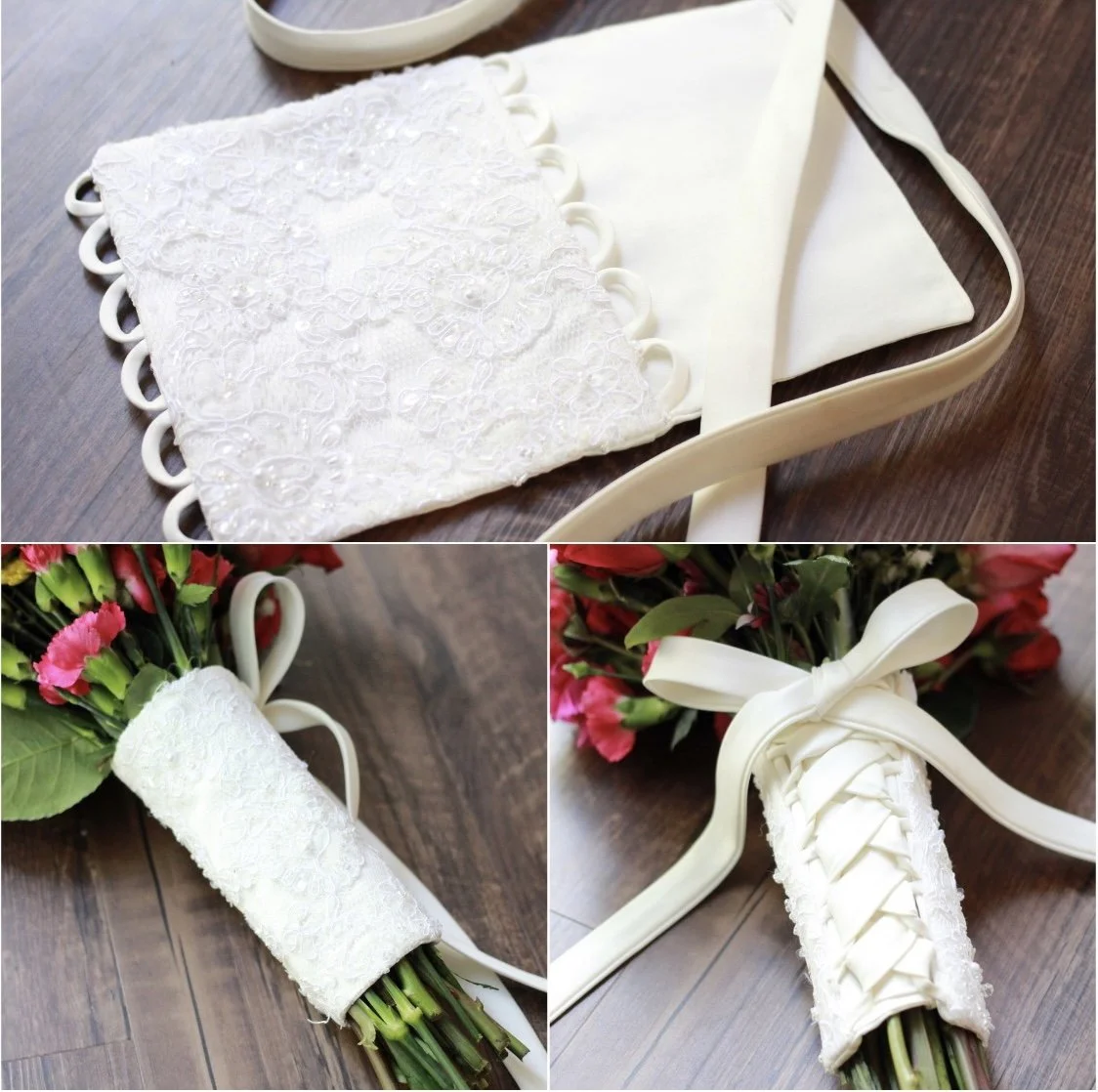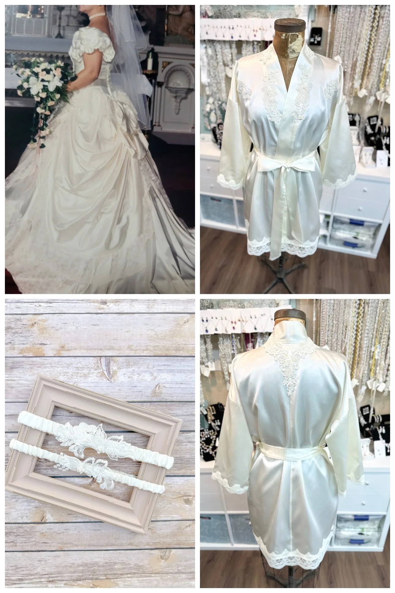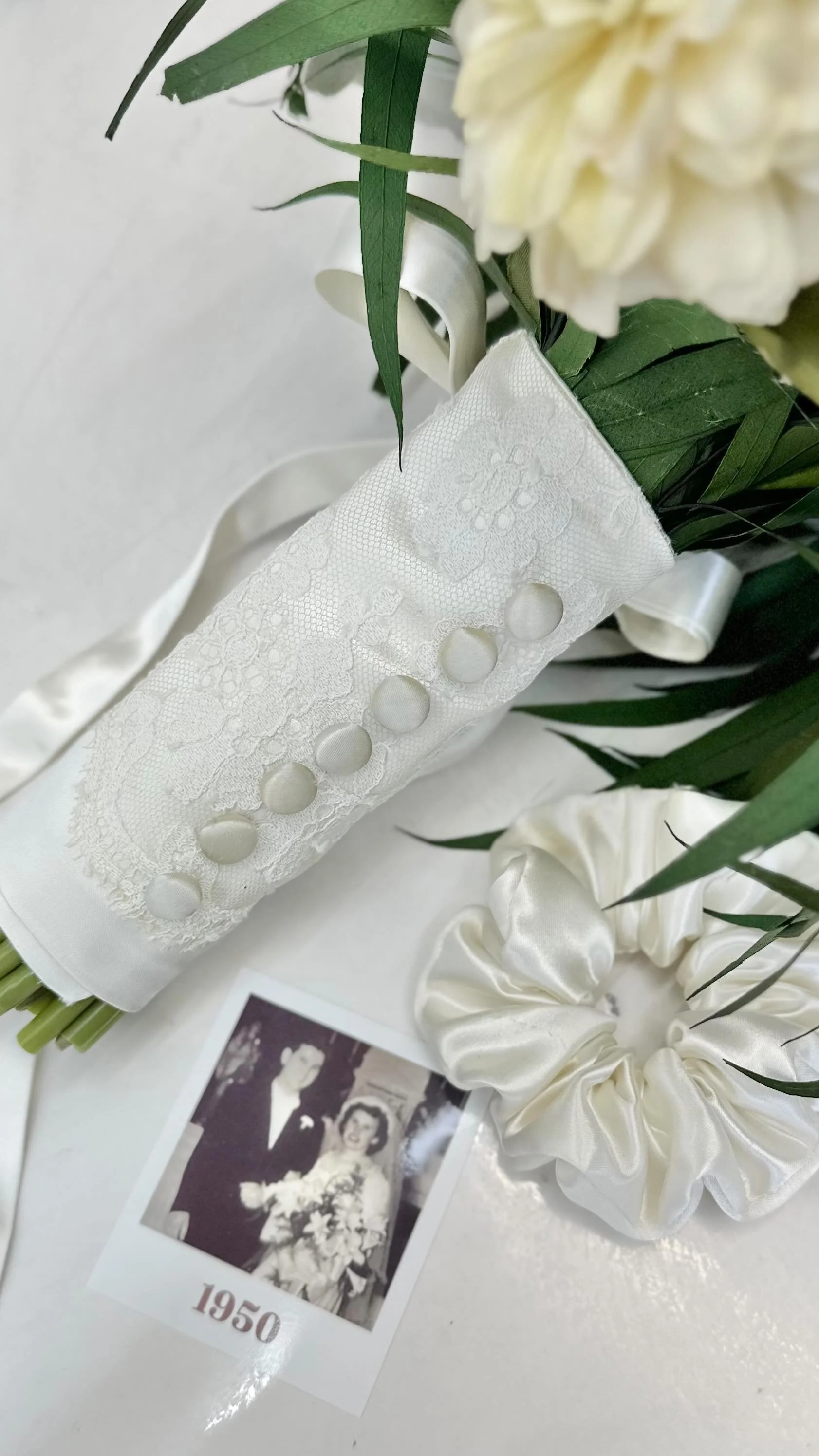 Wear your mother’s dress in a unique and special way with these special heirloom items. Or save the alterations scraps of your own wedding gown to create cherished items for yourself and future posterity!