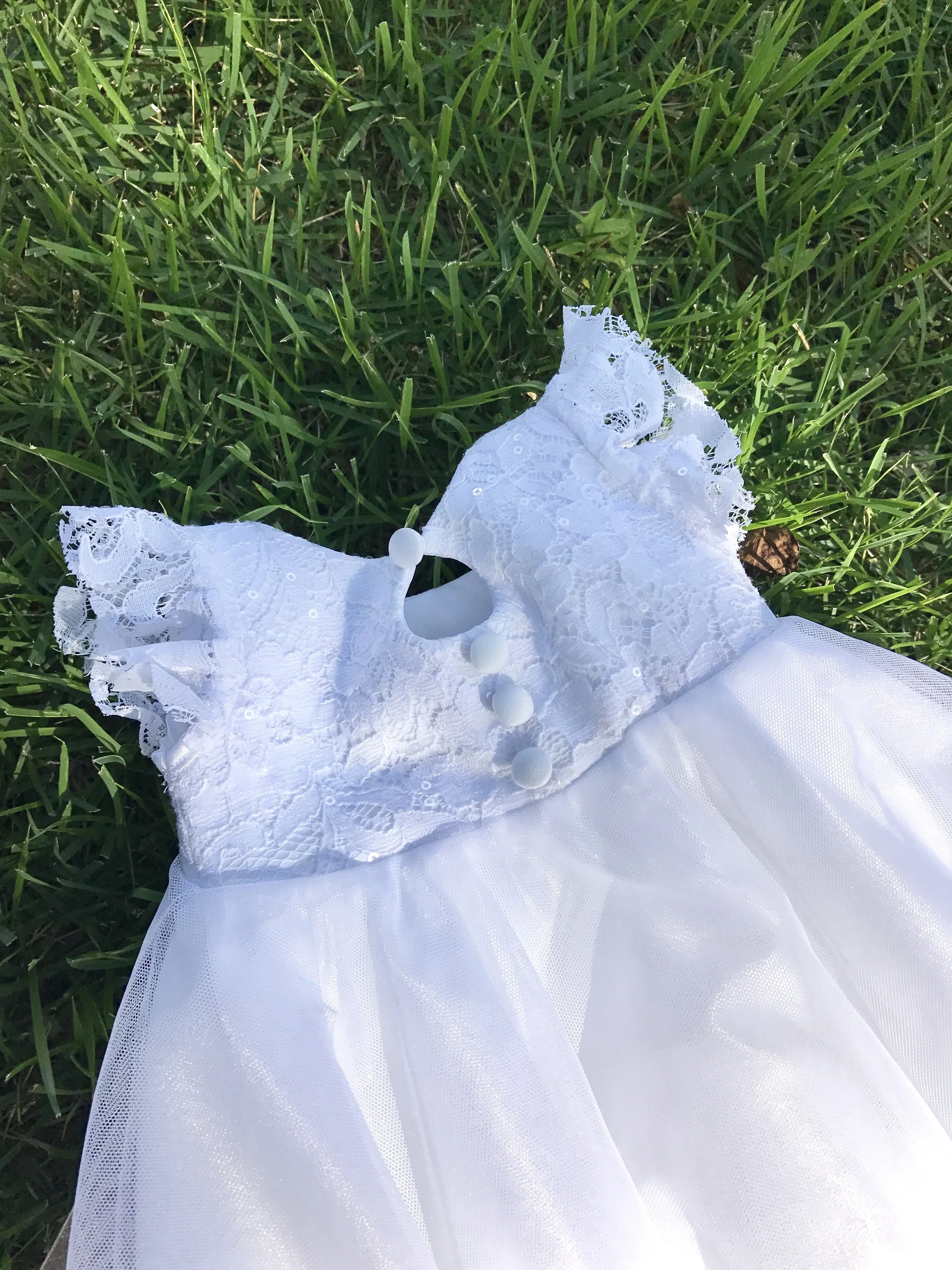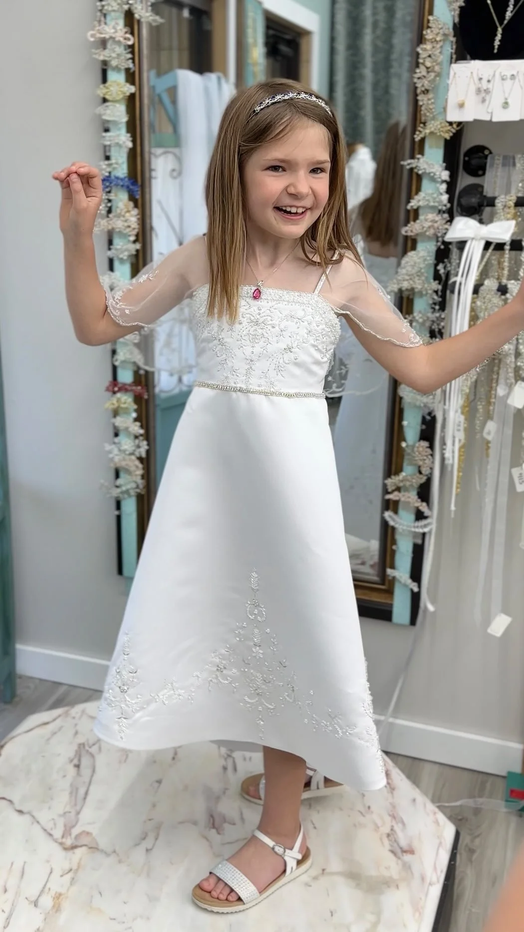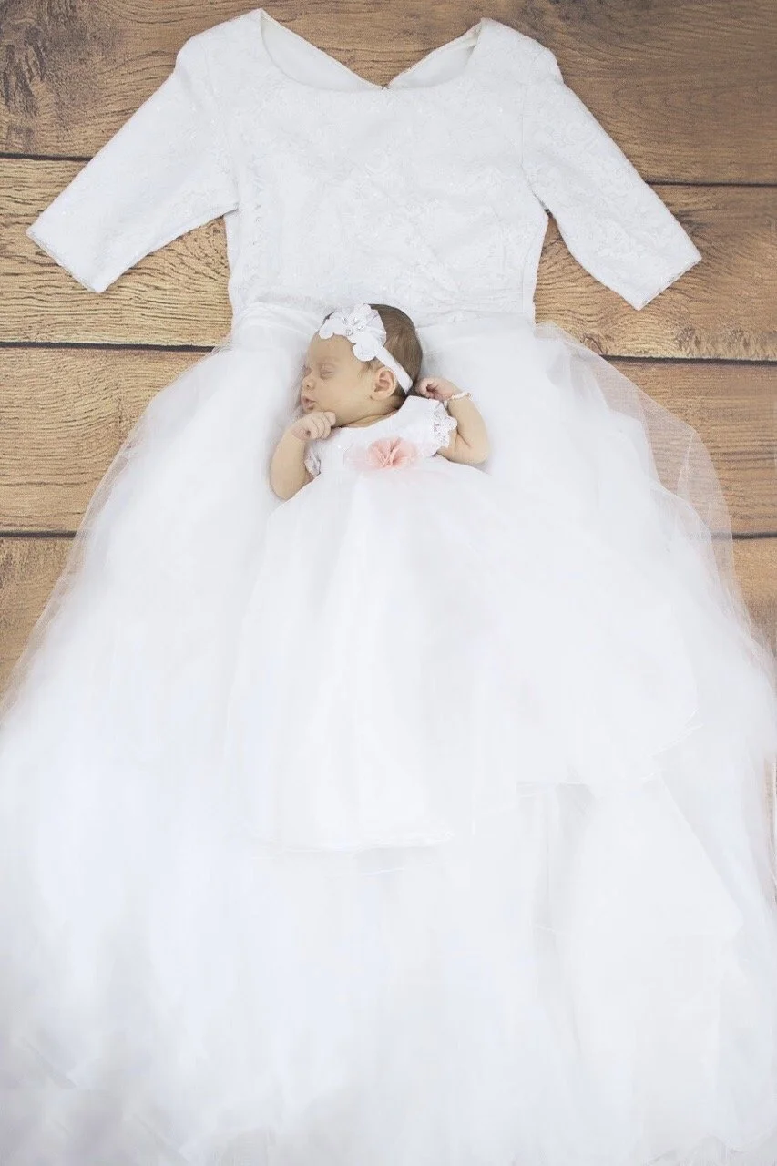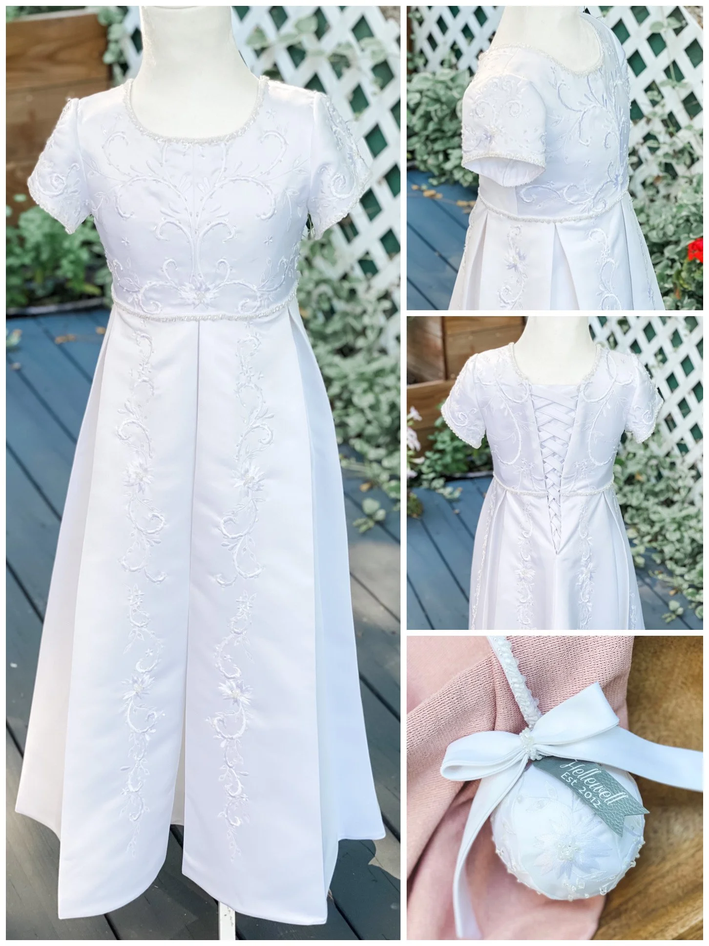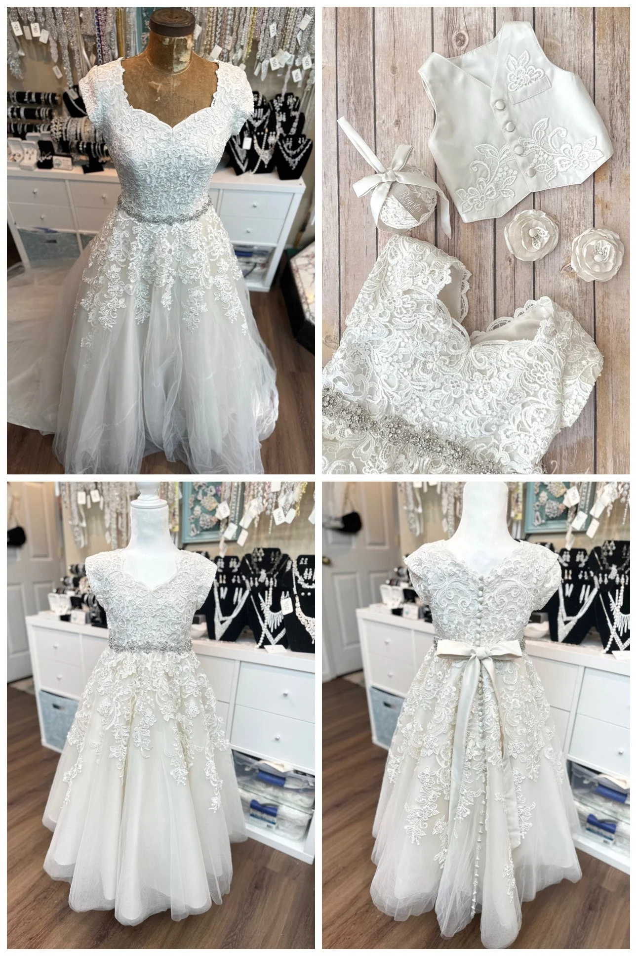 The perfect blessing or christening gown made in the likeness of mom’s gown. Made with a modern style and a long full skirt for your princesses first fancy gown.