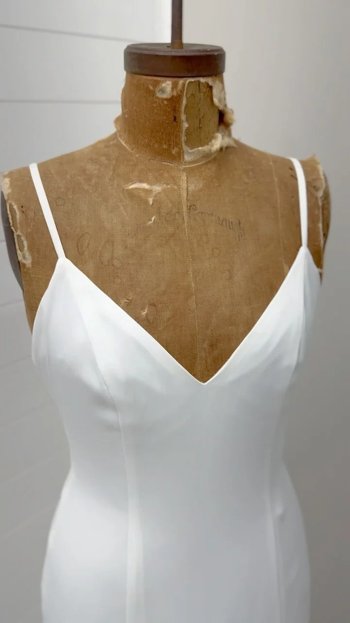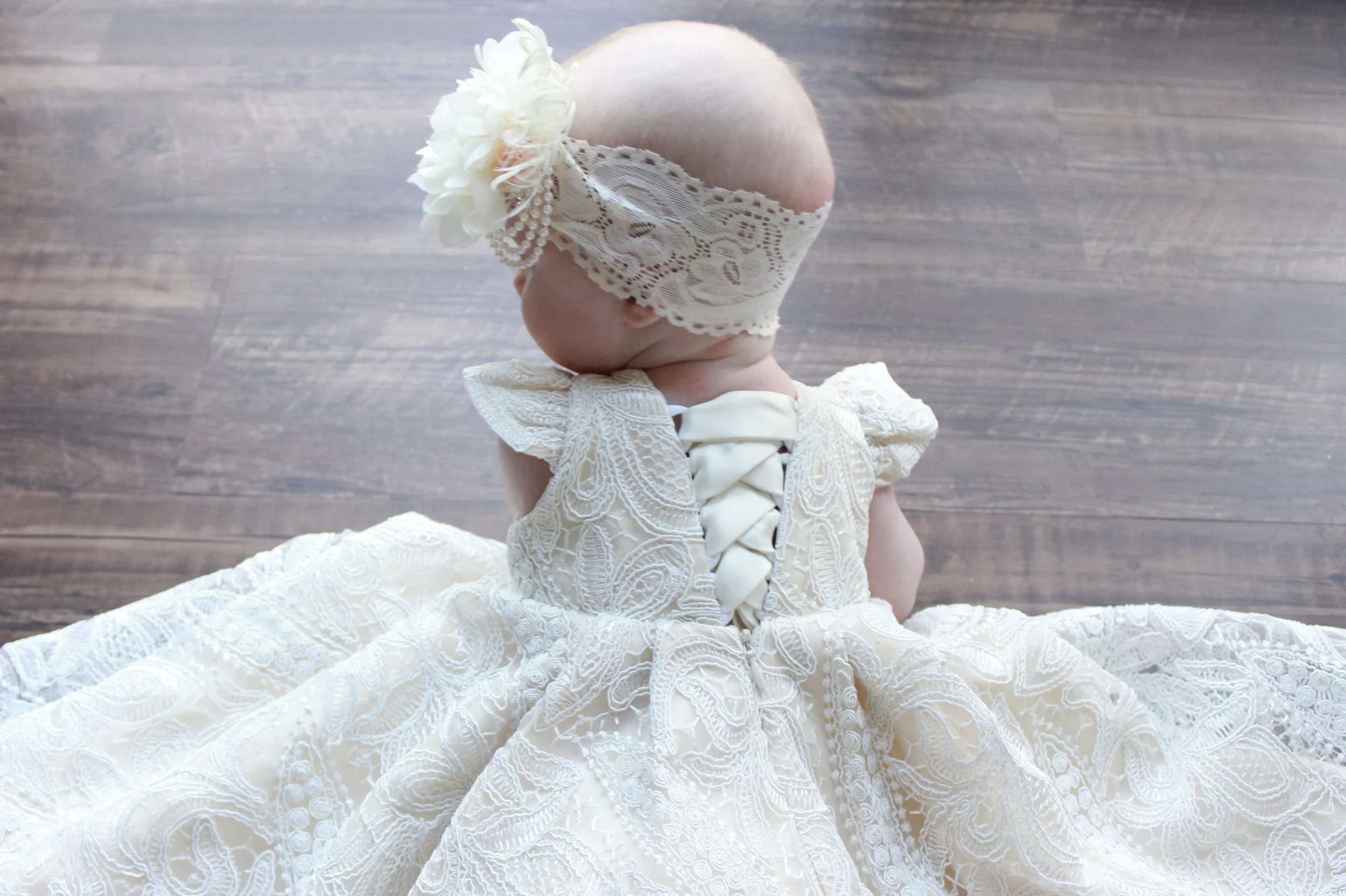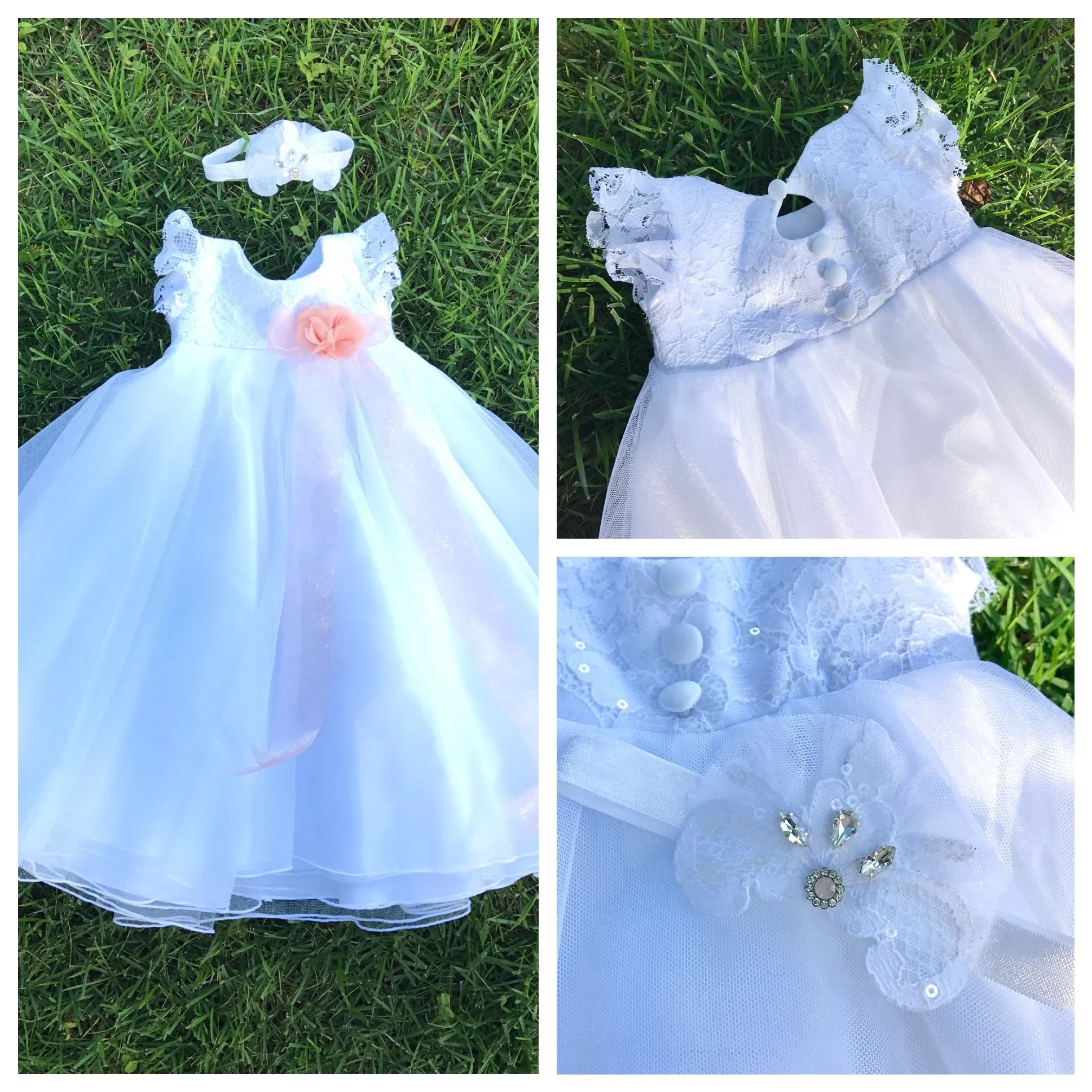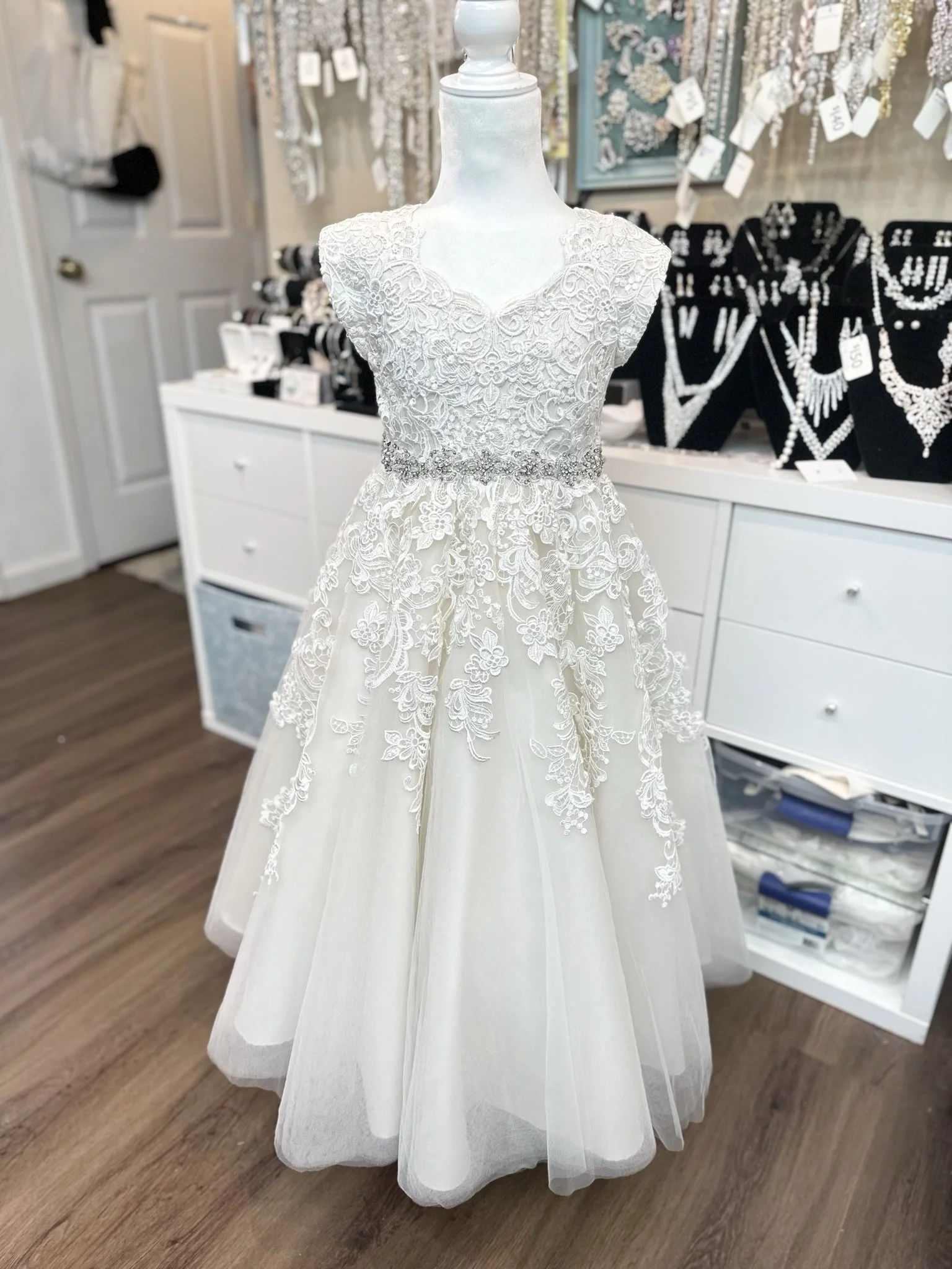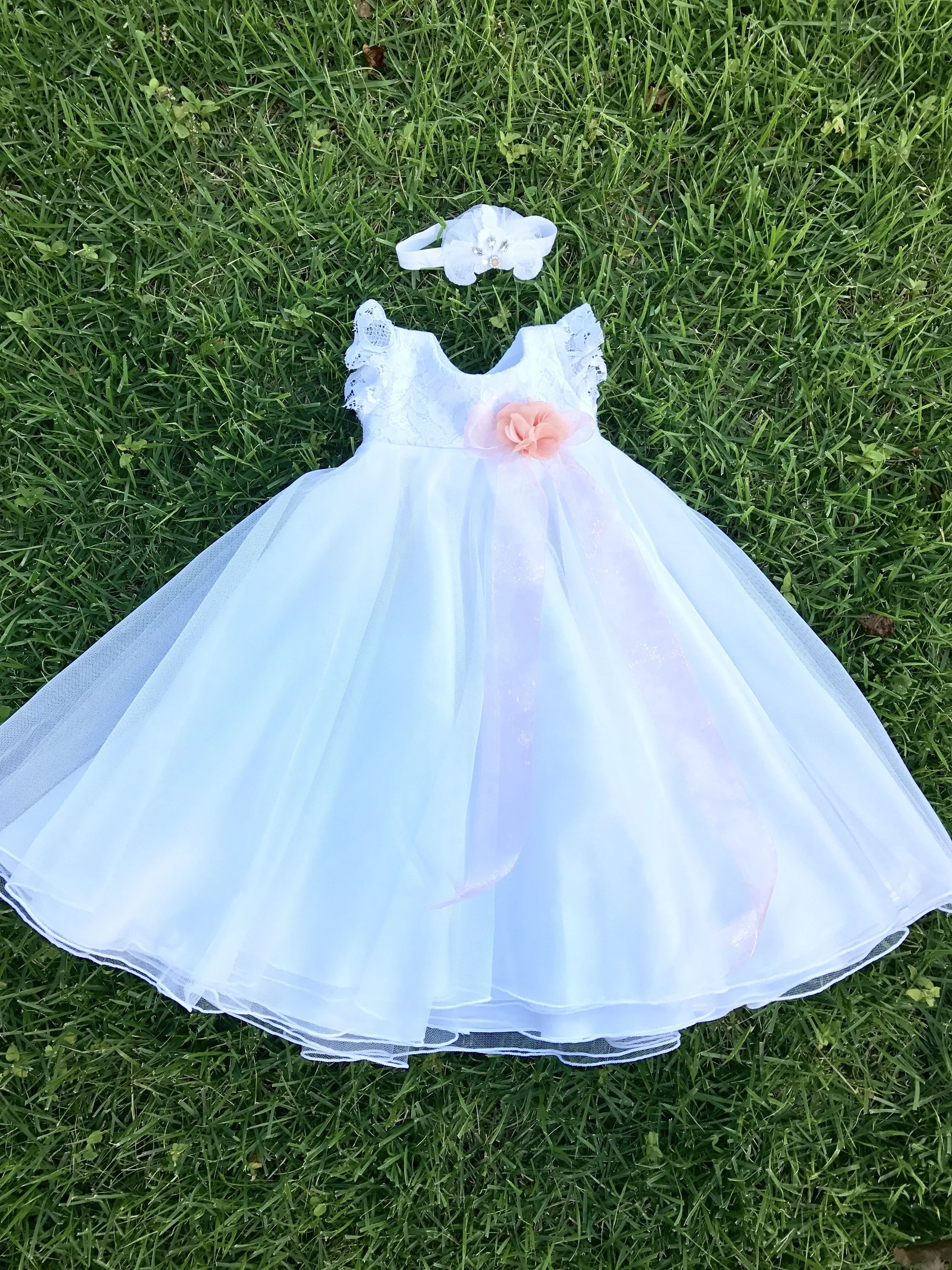 The perfect blessing or christening gown made in the likeness of mom’s gown. Made with a modern style and a long full skirt for your princesses first fancy gown.