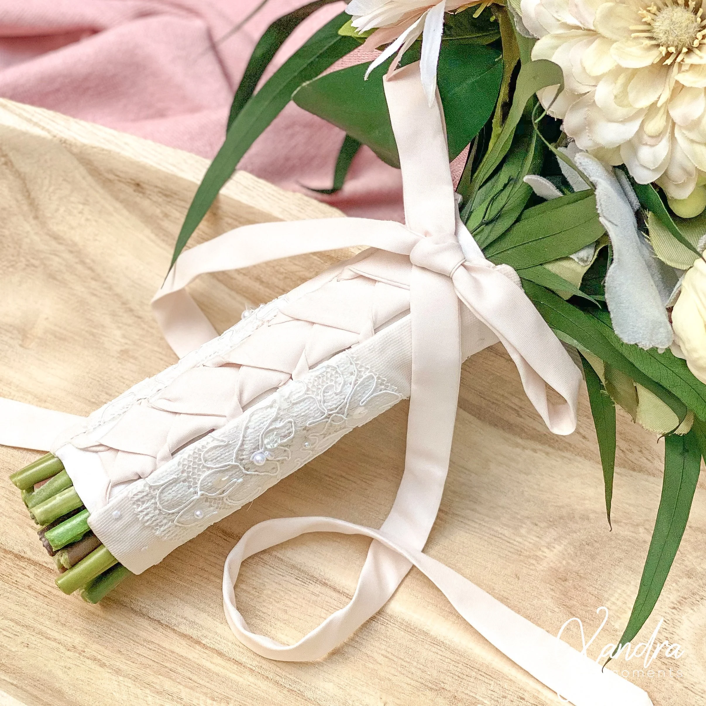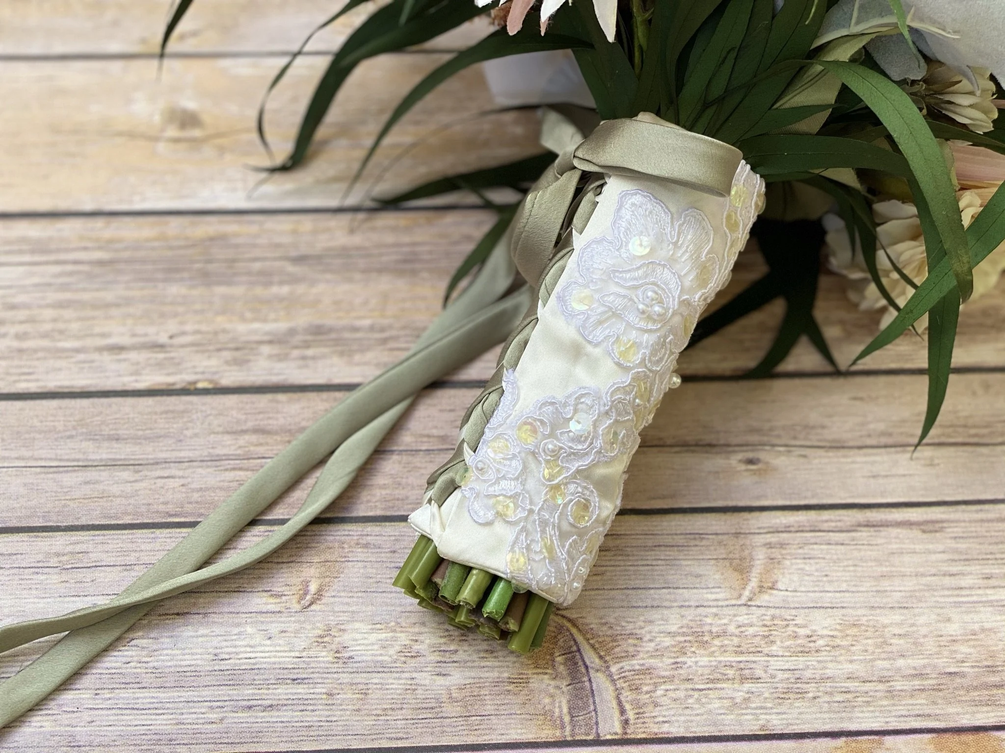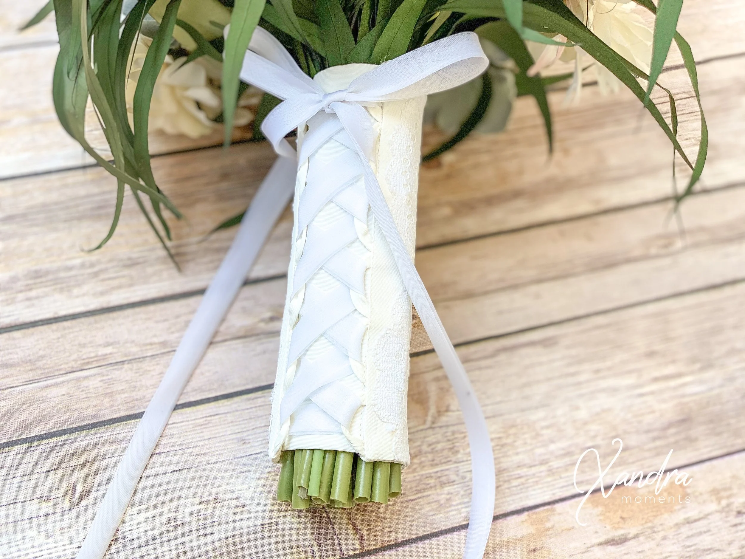 Adjustable from 4” to 12” diameter with our unique lace-up style. Add a pop of color by using your bridesmaid’s hem scraps for the lacing.