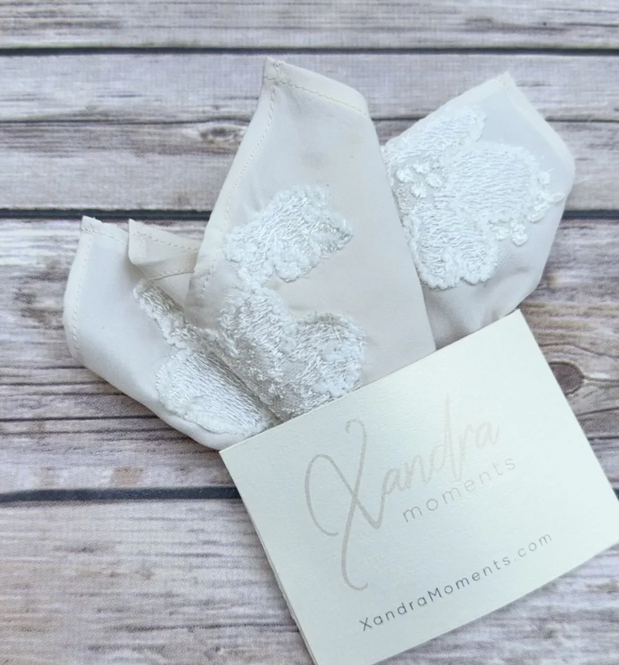 A special something for the groom too. This delicate pocket square is a great way to tie your looks together. Make it extra special with a hand-written love note vinyled onto it!